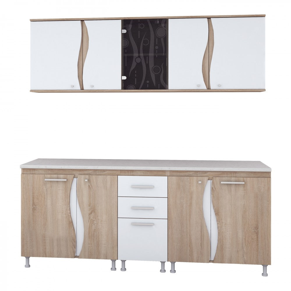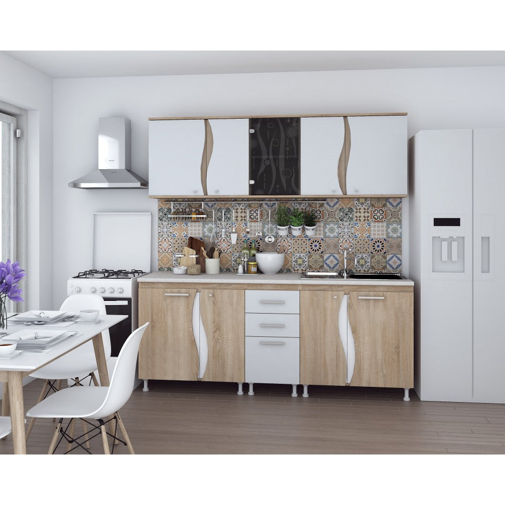 ● Bucataria este in 2 nuante ( PAL Sonoma si PAL Alb ). Partea Inferioara este formata din 3 corpuri ( corp de 80cm cu 2 usi, corp de 40cm cu 2 sertare si o usa si masca de chiuveta ) iar partea superioara se compune din ( 2 corpuri de 80cm si un corp de 40cm cu usa geam ).