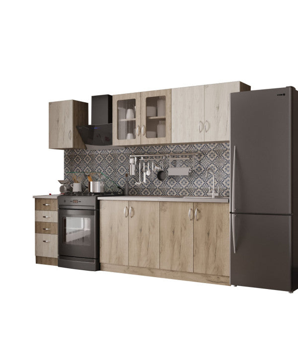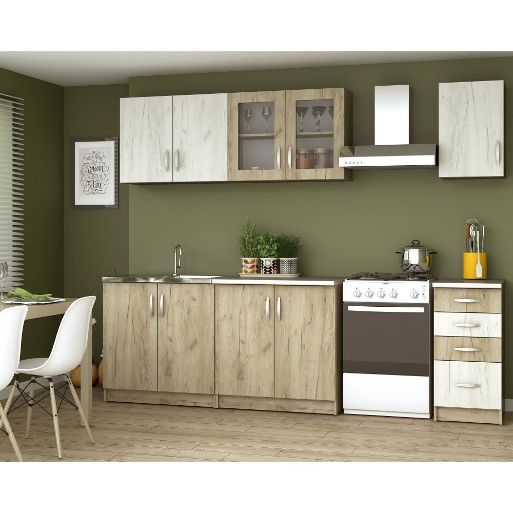 - Bucataria este realizata din PAL Melaminat cantuit cu ABS. Partea inferioara este formata dintr-o masca de chiuveta de 80cm, un corp de 80cm cu 2 usi, un corp de 40cm cu 2 sertare si o usa si blat termorezistent ( blat pentru fiecare corp in parte ), mai putin pentru corpul de masca. In partea superioara, bucataria este formata dintr-un corp de 80cm cu 2 usi, 1 corp vitrrina de 80cm cu 2 usi ( cu geam sablat ) si un corp de 40cm.