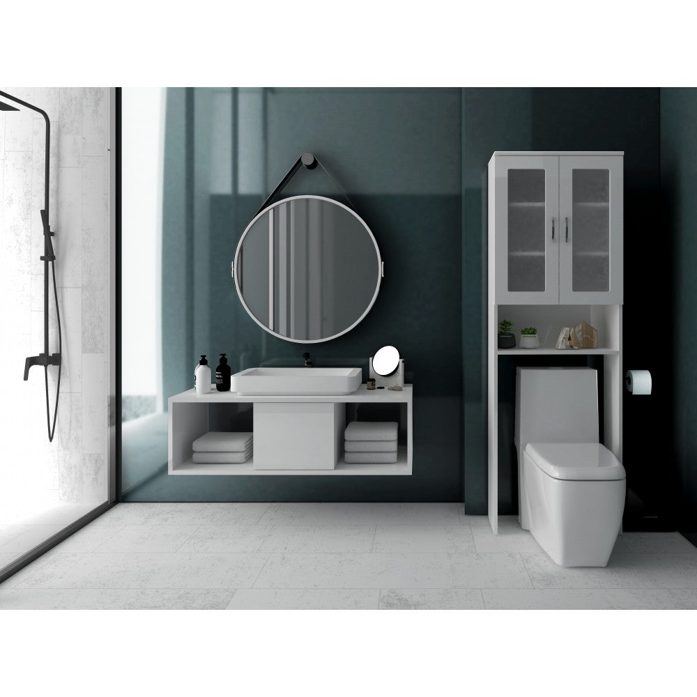 - Construit din PAL melaminat alb, dulapul este o combinație perfectă între estetică și durabilitate. Cu două uși elegant decupate, fiecare cu geam, aduce o notă de eleganță în baie. Interiorul spațios al dulapului permite integrarea facilă a unei mașini de spălat, oferind astfel o soluție ingenioasă pentru economisirea spațiului.
