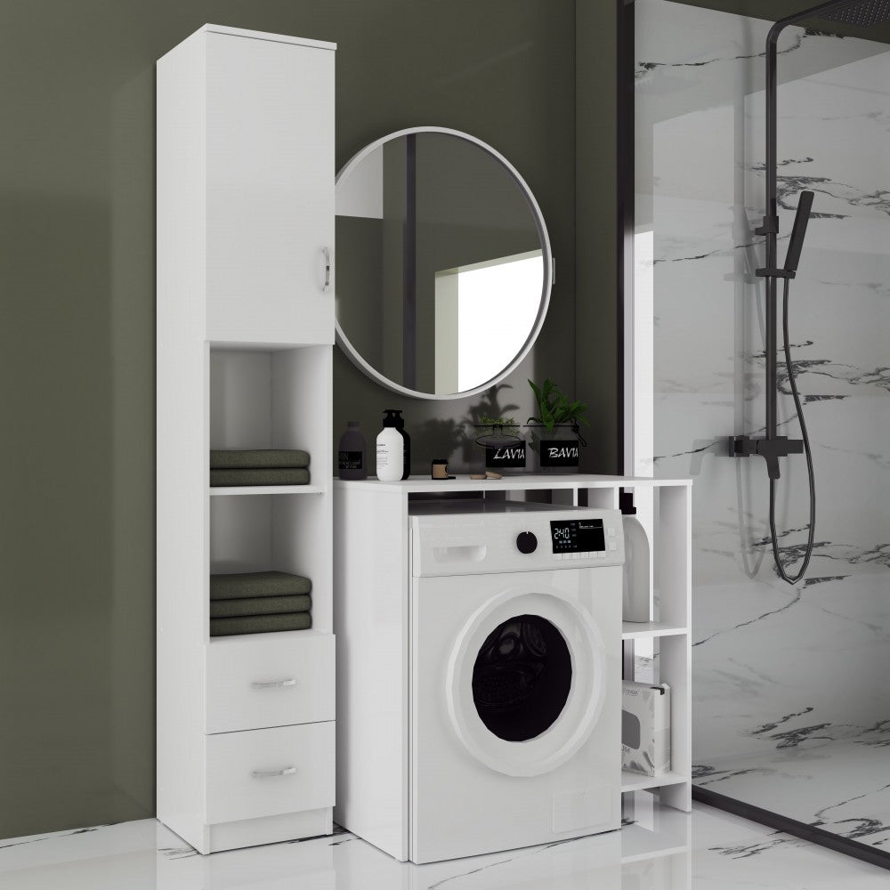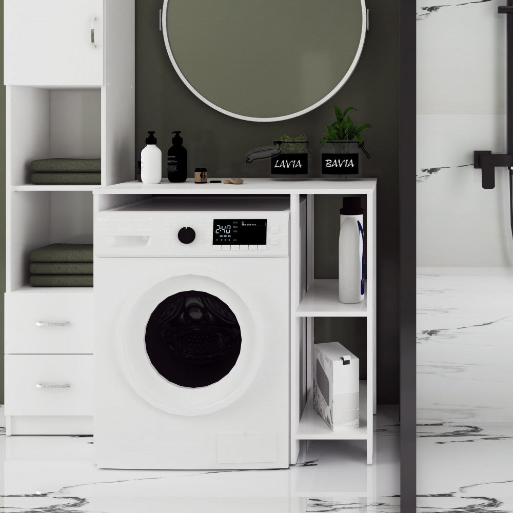 - Dulapul redefinește organizarea în baia ta. Cu designul său ingenios, această masuță include un spațiu încastrat perfect dimensionat pentru mașina de spălat, oferind o soluție elegantă pentru economisirea spațiului.